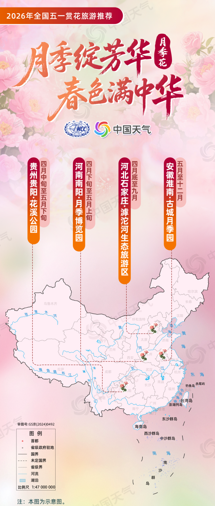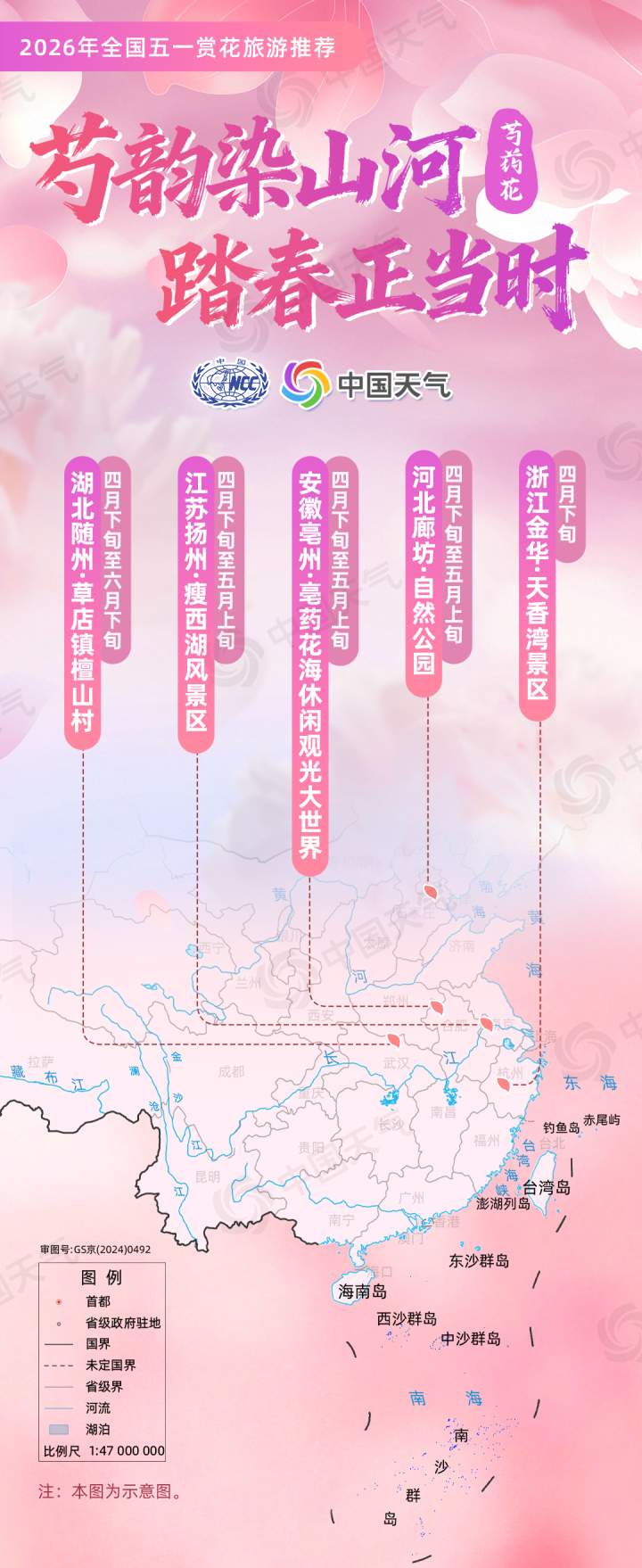 国家气候中心等结合赏花花品类型、盛开气候条件、4月下旬至5月上旬气候趋势预测等,选出涵盖6大类花品及10种特色花的全国赏花旅游景点作为推荐内容,涉及21个省(自治区、直辖市)的43个地市,包含东北、华北、西北、华中、华东、西南、华南等区域,并结合各地小气候差异定向选点。
